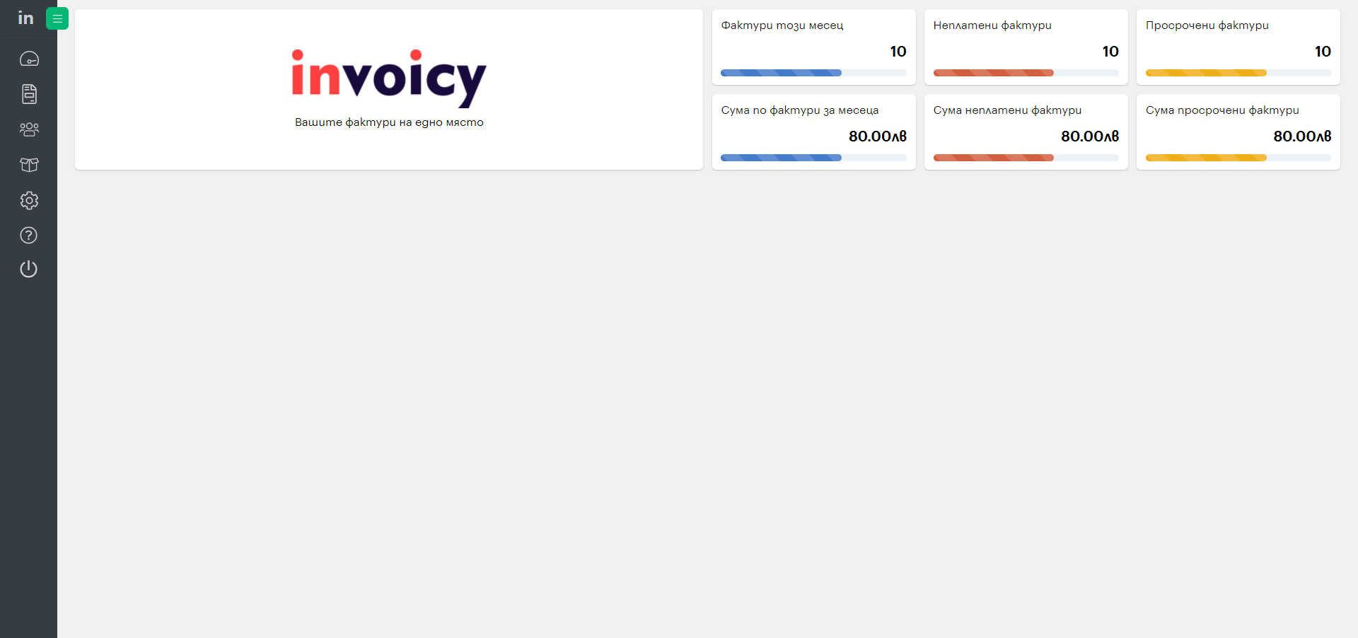 Invoicy е платформа за управление на бизнеса. Изпращате фактури, кредитни/дебитни известия само с няколко кликвания. Споделяйте лесно документацията си онлайн с вашия счетоводител...
